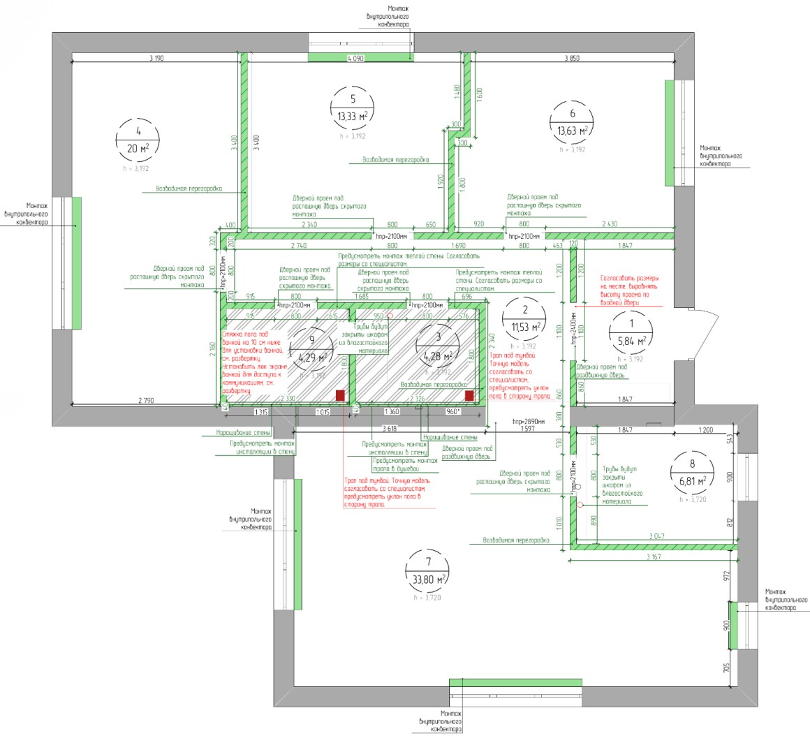 - обетонировать участок плиты подстилающего слоя пола, расположенный под перегородкой, тяжелым бетоном класса не ниже В12.5;
